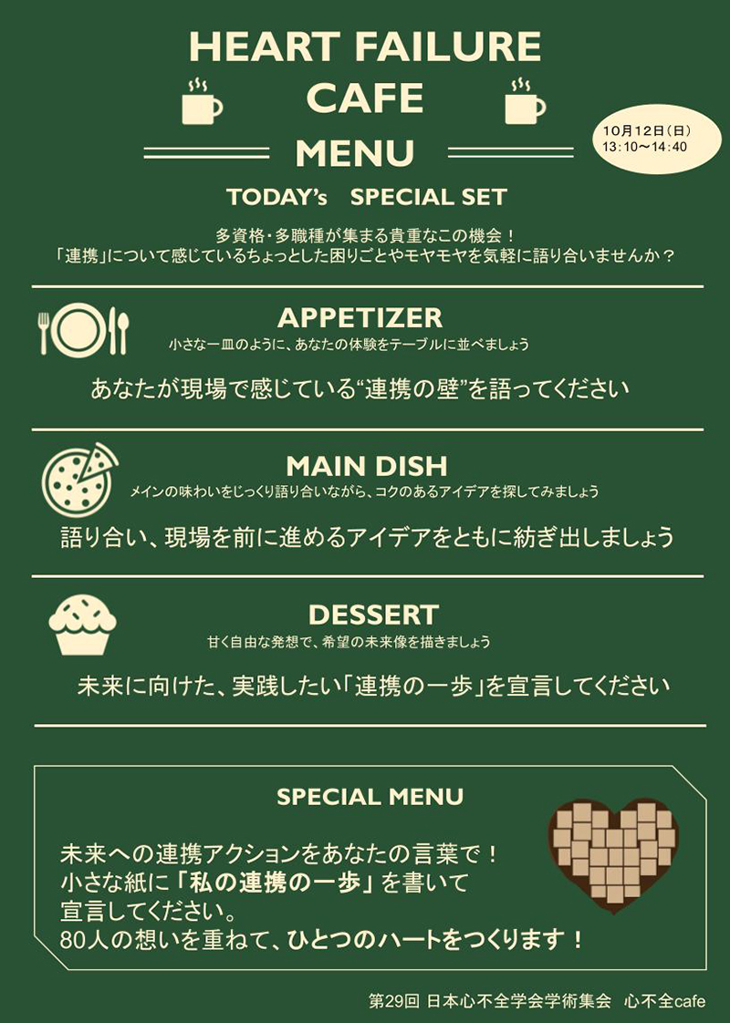 現在、我が国は少子化に伴う労働人口の急減という大きな社会的変化に直面しており、医療・福祉分野においては、人材の確保とその質の向上が喫緊の課題となっています。特に高齢化の進行により、複数の疾患を抱える患者が増加しており、医療・看護・介護が連携した包括的なケアの提供が強く求められています。さらに、医療の高度化や国民の価値観の多様化に伴い、医療従事者には高い専門性に加えて、柔軟な対応力が必要とされています。 このようなヘルスケアを取り巻く社会情勢を背景として、多職種によるチーム医療の質の向上は、今後ますます重要なテーマとなります。本企画では、循環器領域に携わる多職種の有資格者が、カフェ形式というリラックスした雰囲気の中で、それぞれの立場や経験をもとに、専門性を活かした協力体制について語り合える場を提供します。さらに、話し合いを通じて得られた気づきをもとに、「明日からできる、ちょっとした一歩」を各自で目標として言語化し、日々の業務の中で試してみることを目指します。こうした取り組みによって、実効性のある連携の土台づくりに寄与したいと考えています。
